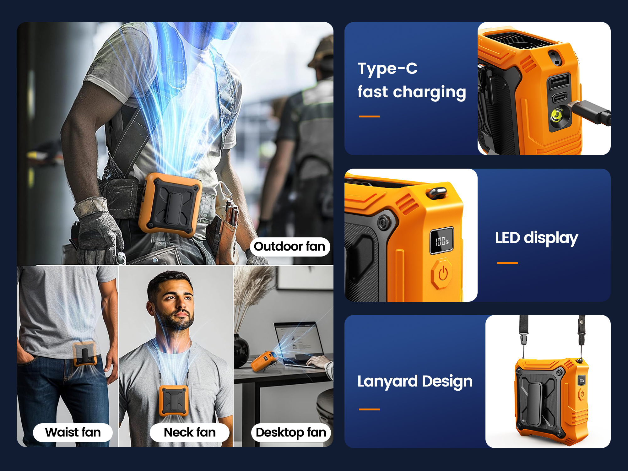Akumulatorowa wydajność i inteligentna konstrukcja Jako doświadczony producent wentylatorów przenośnych, MIJIDI wyposaża model M38B w akumulator i wydajny system napędowy, dostosowany do noszenia. Wiele ustawień prędkości pozwala dostosować przepływ powietrza do warunków otoczenia – od łagodnego ciepła po intensywne treningi. Pozycja mocowania w pasie optymalizuje chłodzenie, cyrkulując powietrze wokół dolnej części tułowia, redukując gromadzenie się ciepła i zapewniając stały komfort podczas wykonywania zadań.