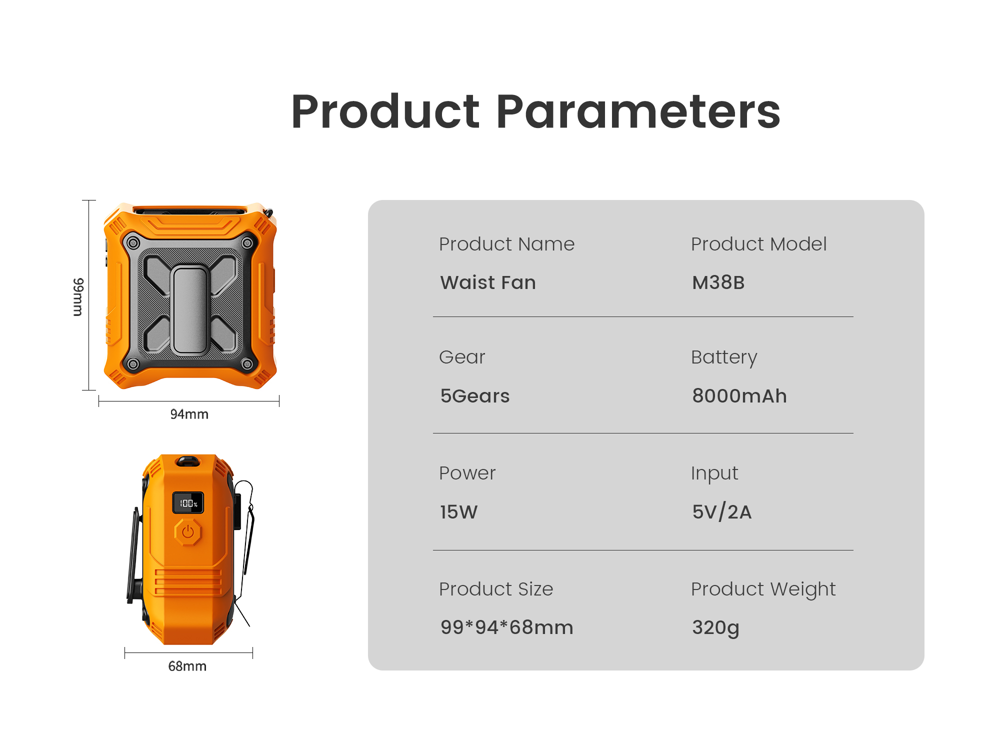 Wentylator taliowy MIJIDI M38B oferuje chłodzenie bez użycia rąk, noszone na ciele, dzięki klipsowi na pasek. Jako dostawca wentylatorów przenośnych i hurtowy wybór wentylatorów taliowych, zapewnia przepływ powietrza wokół talii biegaczom, ogrodnikom, pracownikom magazynów i uczestnikom festiwali.